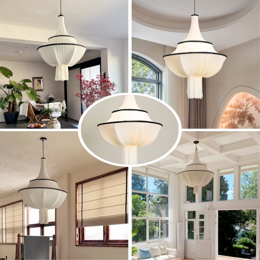 Indulge in elegance with this chandelier. Its satin fabric shade diffuses light to cast a warm, creamy glow. The soft curves and luxurious feel add a touch of sophistication. Perfect for living rooms or dining areas, it becomes an instant focal point, enhancing your space with a refined charm that transforms any ordinary room into a haven of style.