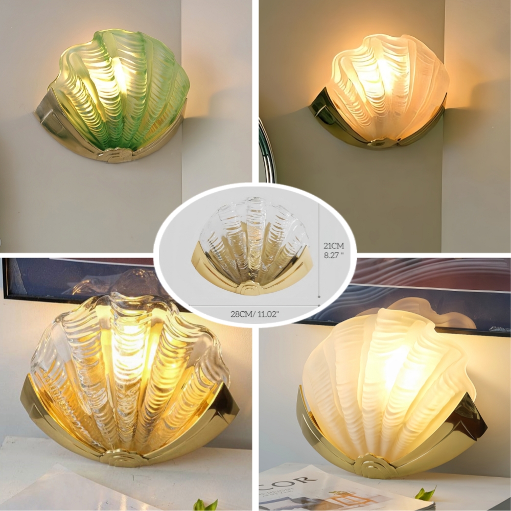 This brass shell glass wall lamp blends French modern elegance with decorative allure. The intricate shell motifs on glass diffuse warm light softly, casting delicate patterns that elevate living rooms, bedrooms, or aisles. A timeless piece merging art deco charm with sophisticated craftsmanship.