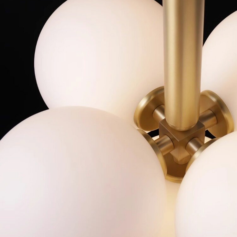 This sculptural chandelier features a cluster of ribbed glass globes, half frosted and half metallic, anchored by a sleek brass stem. It casts warm, ambient light through textured glass, creating a modern focal point for dining rooms or entryways. Its balanced design blends geometric precision with soft, luminous charm, elevating contemporary interiors.