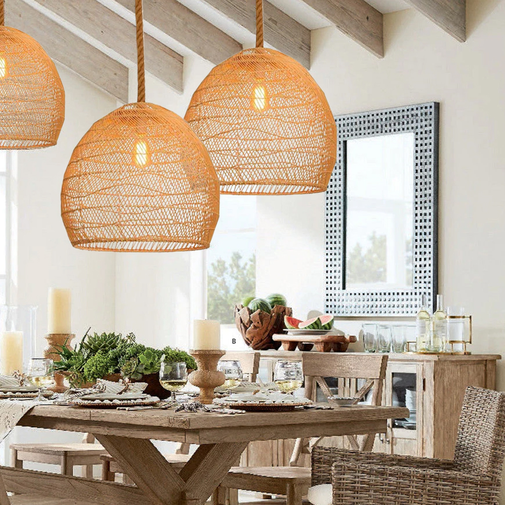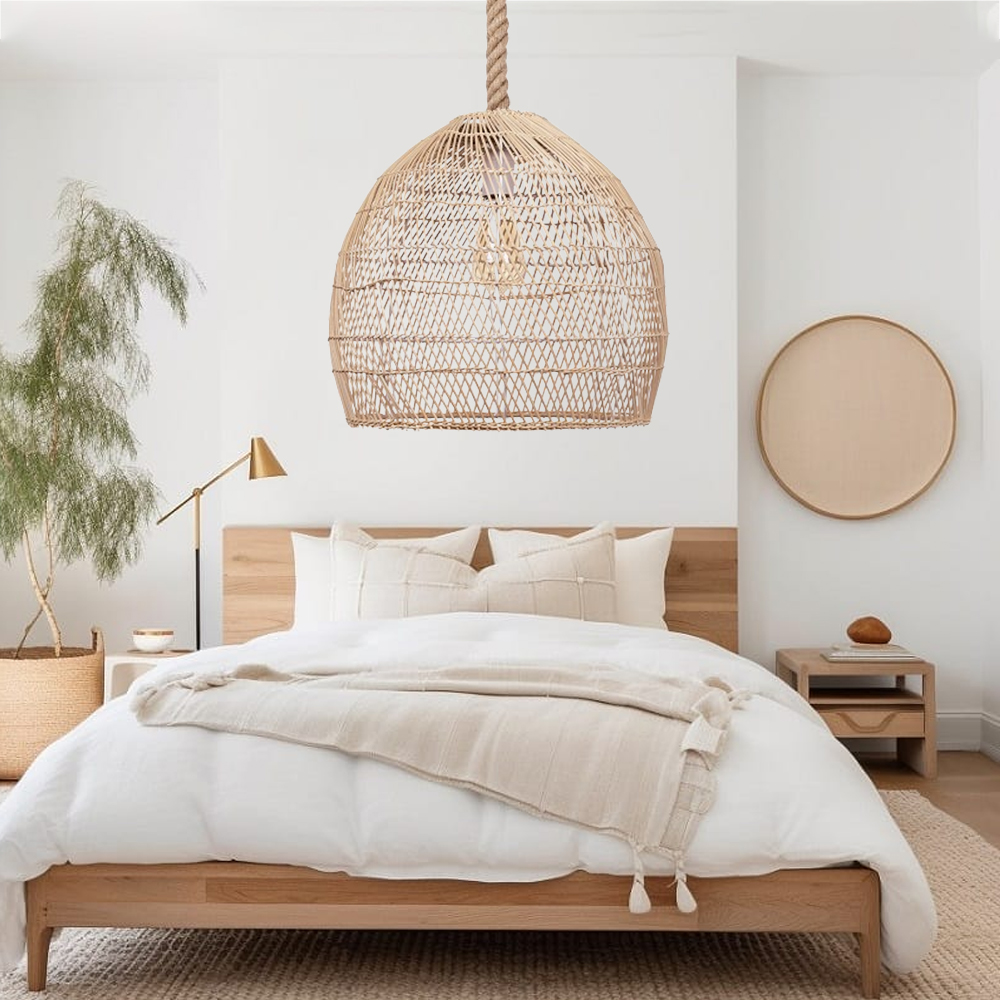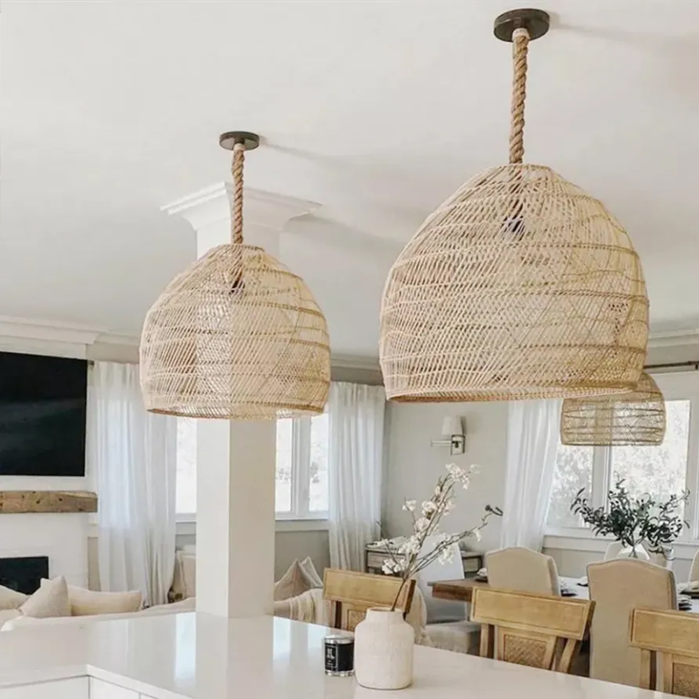 With its open-weave design, this pendant light emits a soft and warm glow, creating a cozy and inviting ambiance in your space.  The combination of the rustic hemp rope and the intricate rattan weaving creates a versatile design that complements various interior styles, whether it be modern, bohemian, or farmhouse.