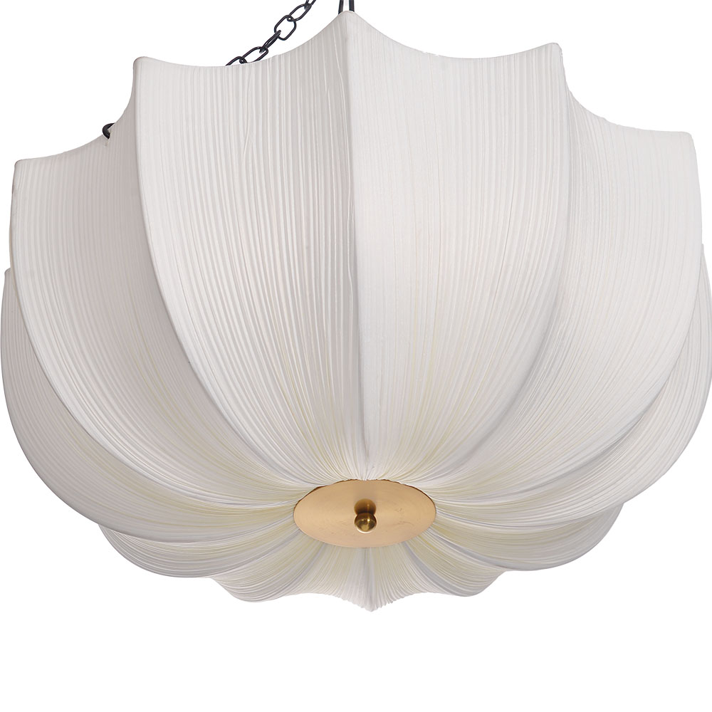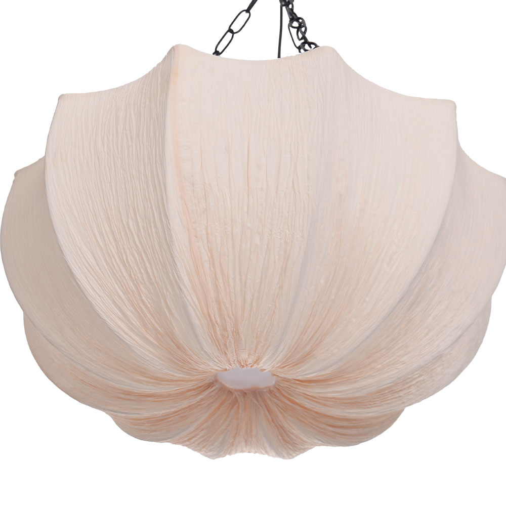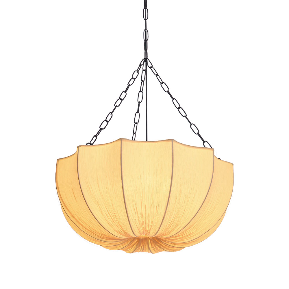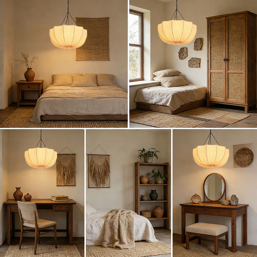 This is a Japanese retro Wabi Sabi style pendant light. The fabric material exhibits a unique texture, bringing warm and soft light to the living room and bedroom. It can create a peaceful atmosphere, fill the space with charm, and is a high-quality lighting fixture that combines lighting function and artistic beauty.