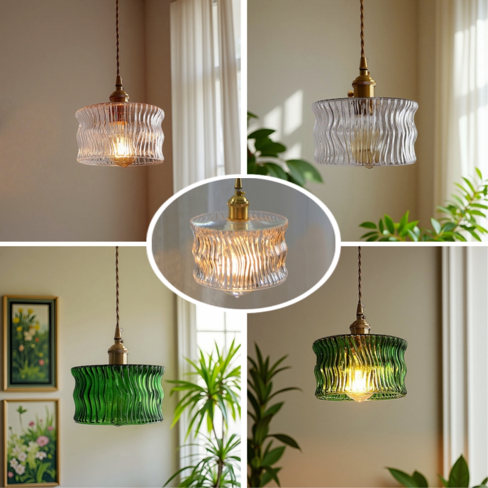 Japanese Style Retro Brass Tree Patterned Corrugated Glass Pendant Light