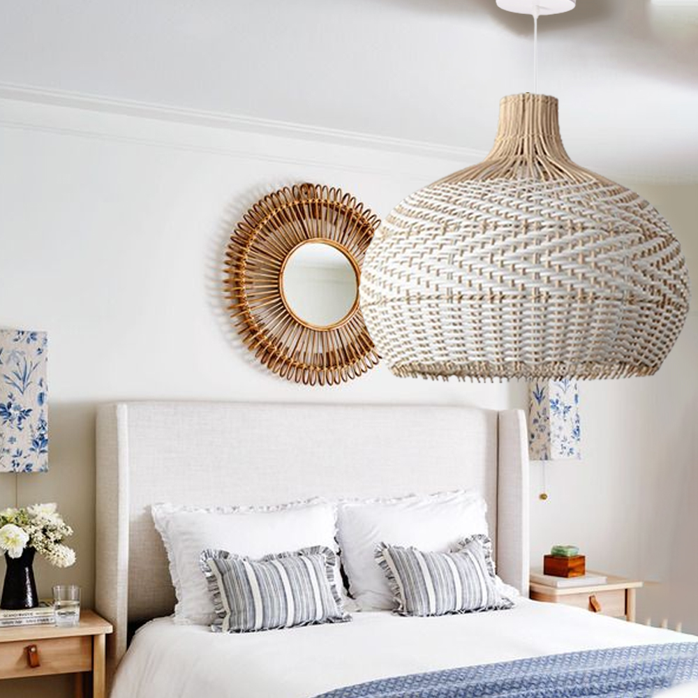 Natural Rattan Basket Pendant Lamp Kitchen Island Decor White Light Shade