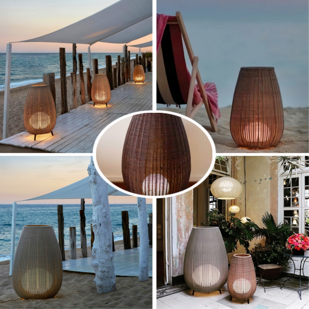 This outdoor rattan floor lamp brings natural charm to courtyards and lawns. Fully waterproof, it stands strong against the elements while casting a warm, inviting glow. Its woven texture adds rustic elegance, blending seamlessly with outdoor spaces to create a cozy, ambient atmosphere.