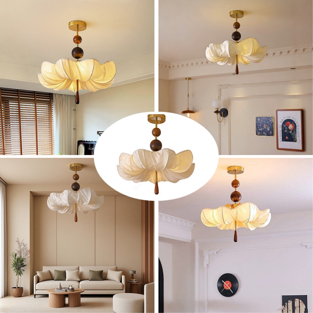 This retro cream ceiling light features a charming fabric flower shape, adding soft elegance to bedrooms, living rooms, or restaurants. Its semi-flush mount fits average ceilings, casting warm, cozy glow. Nostalgic charm meets subtle sophistication—effortlessly elevating any space.