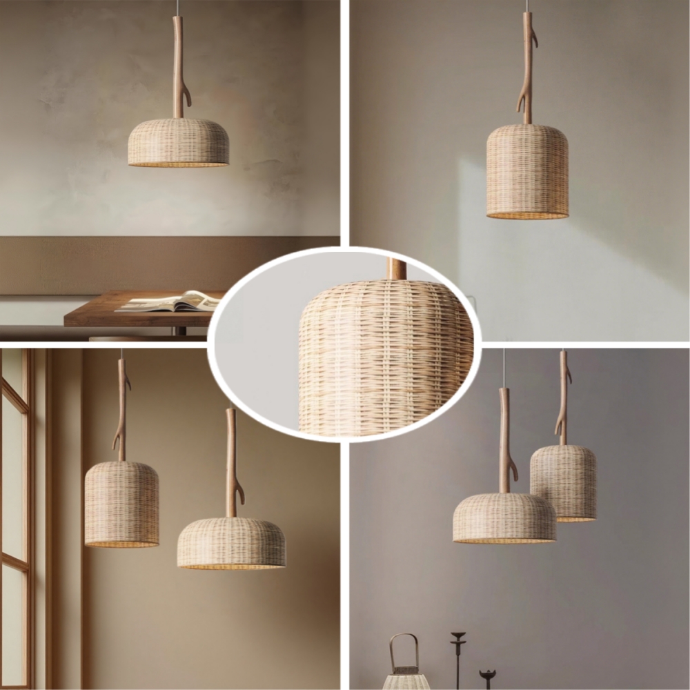 This pendant light embodies wabi-sabi’s quiet beauty, with handwoven rattan that shows subtle, natural texture—no perfect lines, just organic charm. Its combination design (think layered or paired shades) softens light, casting a warm, diffused glow over dining tables or reading corners. Blending simplicity with artisanal craft, it turns "imperfection" into elegance, fitting seamlessly into spaces that crave calm, earthy warmth over sleek minimalism.
